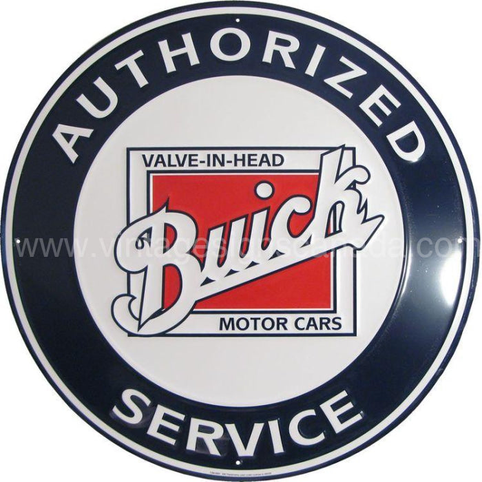 This Blue Buick Service Round Tin Sign measures 24" across. It comes pre-drilled ready to hang
