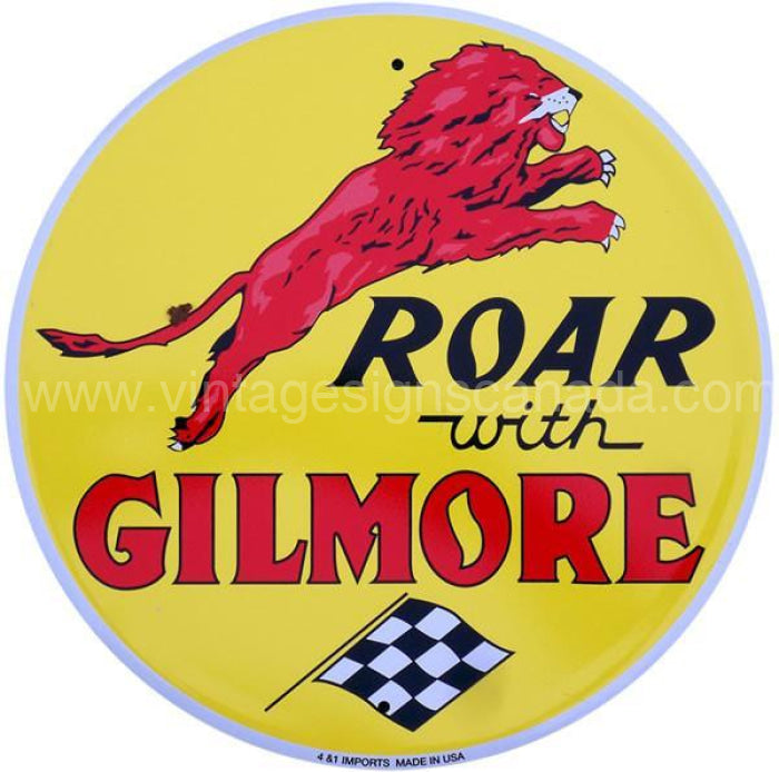 This Roar With Gilmore Round Tin Sign measures 24" across. It comes pre-drilled ready to hang.