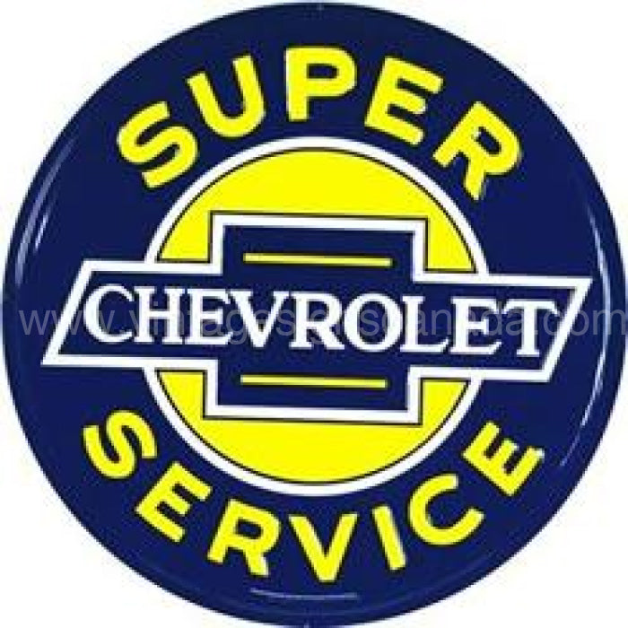 This Super Chevrolet Service Round Tin Sign measures 24" across. It comes pre-drilled ready to hang. S-SCRD17