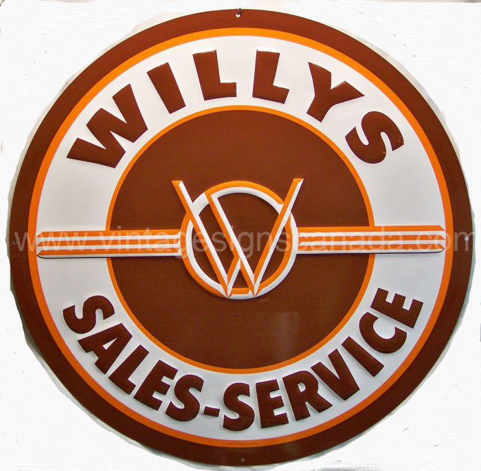 This Willys Sales & Service Round Tin Sign measures 24" across. It comes pre-drilled ready to hang.