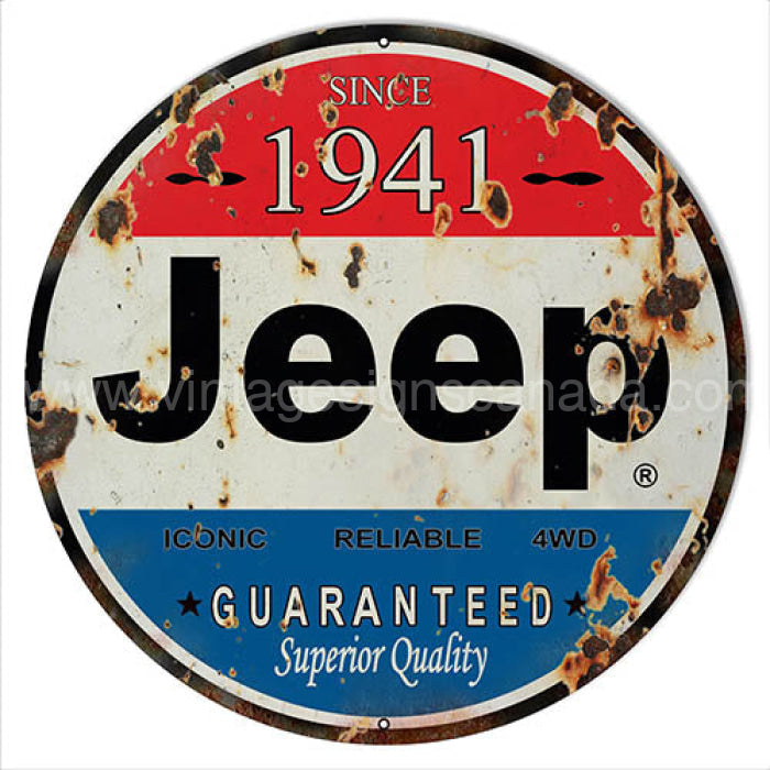 Aged Looking 1941 Jeep Reproduction Sign. 14x14 24g steel. This Sign Has Eyelets For Mounting. Made In The USA.