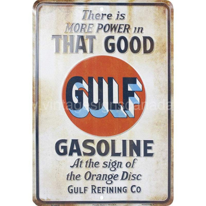 That Good Gulf Embossed Tin Sign. Measures 8" wide x 12" high. Made in the USA.