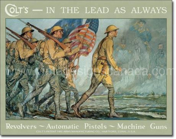This Colt-In The Lead tin sign measures 12.5"h x 16"w. Sign comes pre-drilled ready to hang.