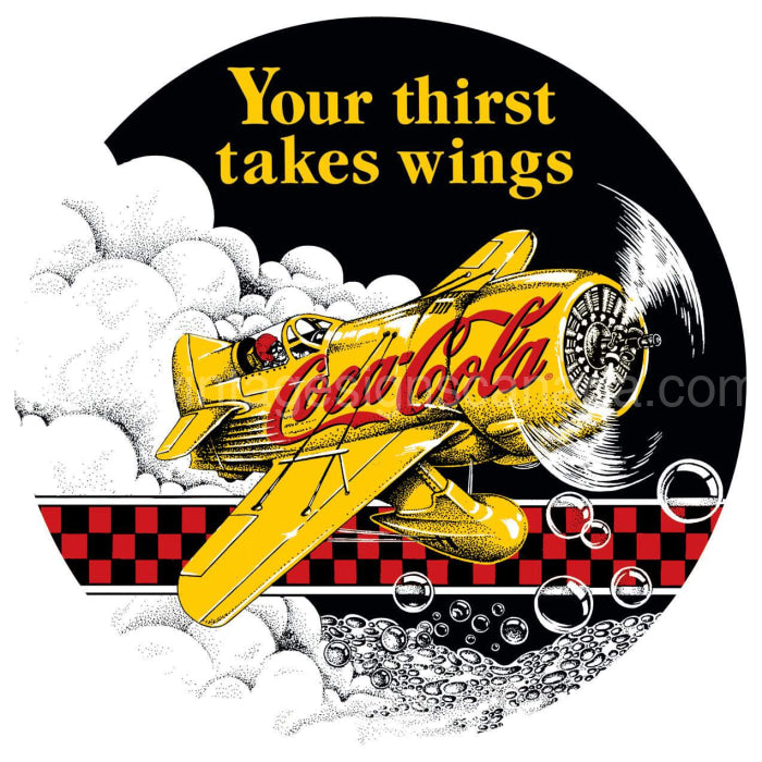 This Coke Gee Bee Racer embossed vintage tin sign measures 14" in diameter. Pre-drilled, ready to hang.