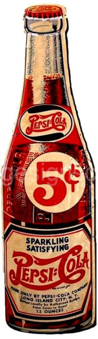This Pepsi 5c Molded Bottle Die Cut TinSign measures 22"h x 6"w. Each sign comes pre-drilled, ready to hang.